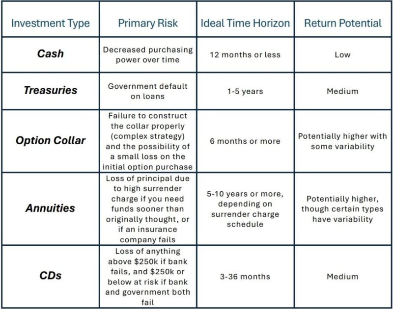 This is not a comprehensive list of assets considered to be low risk, but it offers some of the most popular places that investors tend to go for stability. Here is a useful chart to summarize what we’ve learned.