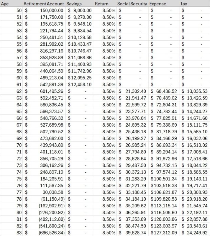 Susan is 50 years old and has $150,000 saved into a 401(k) with her employer. She makes $60,000/year and wishes to know if she can retire at 62.